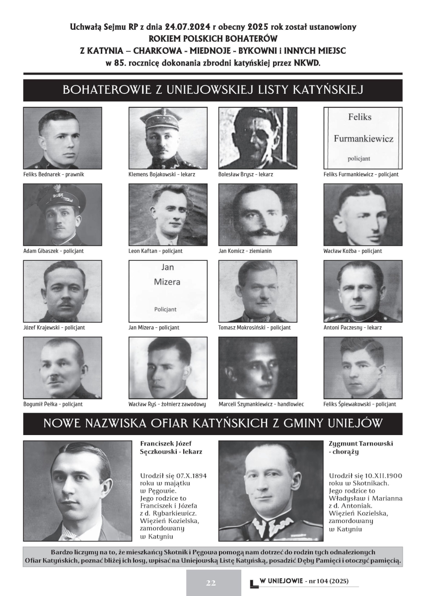 13 kwietnia 2025- w dniu Pamięci Ofiar Zbrodni Katyńskiej Msza św. w uniejowskiej świątyni w intencji pomordowanych, wymienionych na uniejowskiej liście katyńskiej.